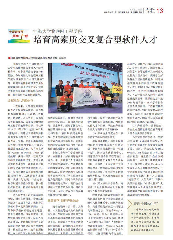 2021年5月,物联网工程公司陈慧萍老师接受了工信部主流媒体“中国信息化周报”专访, 2021年6月7日发行的“中国信息化周报”(18总1419期)设置专栏介绍了物联网工程公司的人才培养模式, 题为“培育高素质交叉复合型软件人才”,介绍了公司产教融合培养复合型软件人才模式。