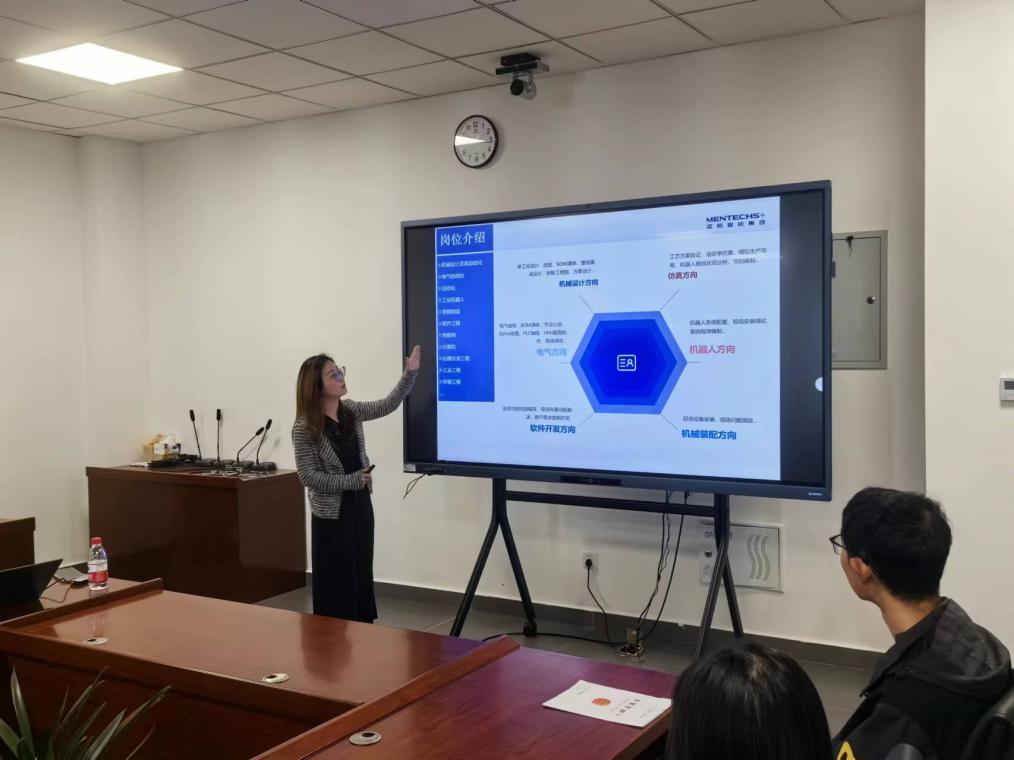 在宣讲环节,孟腾公司人事经理陈梅向同学们详细介绍了公司的发展、主营业务、市场前景、核心技术等情况,围绕同学们切实关心的待遇问题,从职员培养计划、发展成长路径、公司福利待遇等几个方面进行了详细阐述与答复。