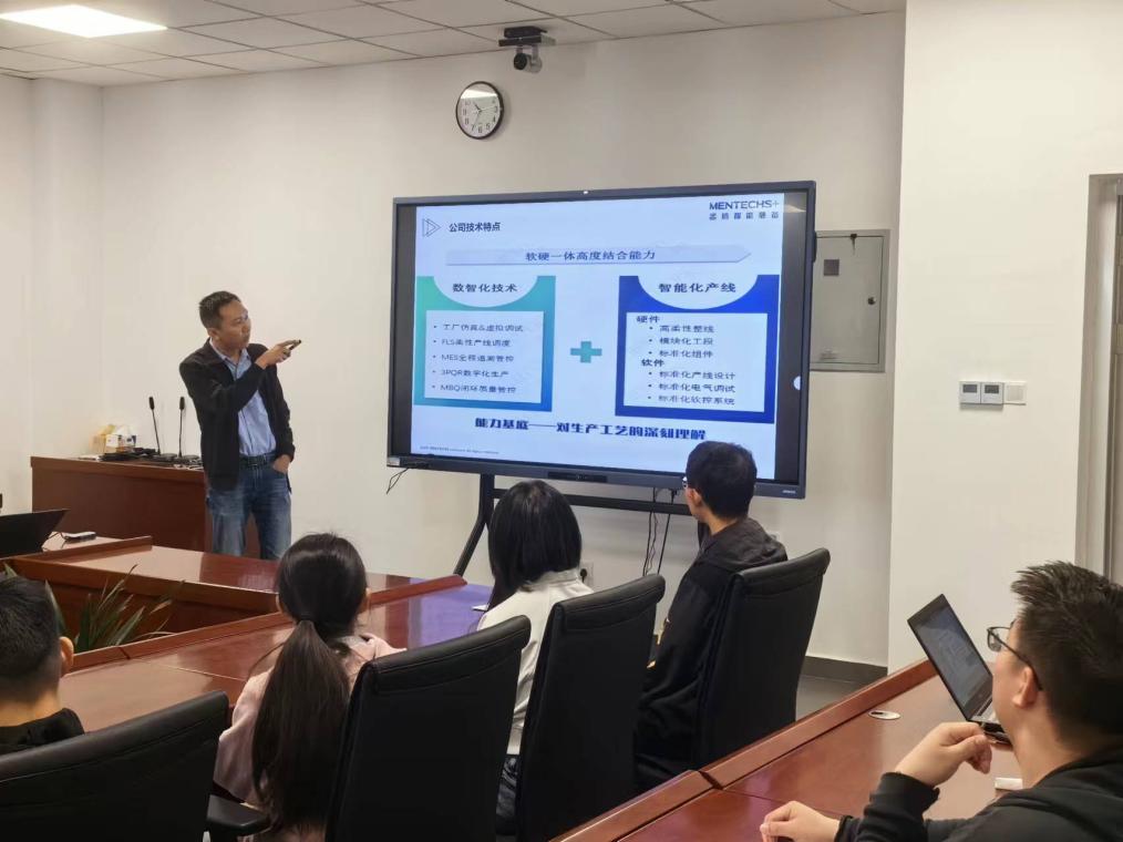 孟腾公司业务经理张文雄介绍了公司的相关业务及技术特点,向同学们着重分享了“数智化技术+智能化产线”的生产工艺理念与“黑灯车间”的相关概念,号召同学们要敢想敢拼,勇于实现属于自动化人心中的梦想。