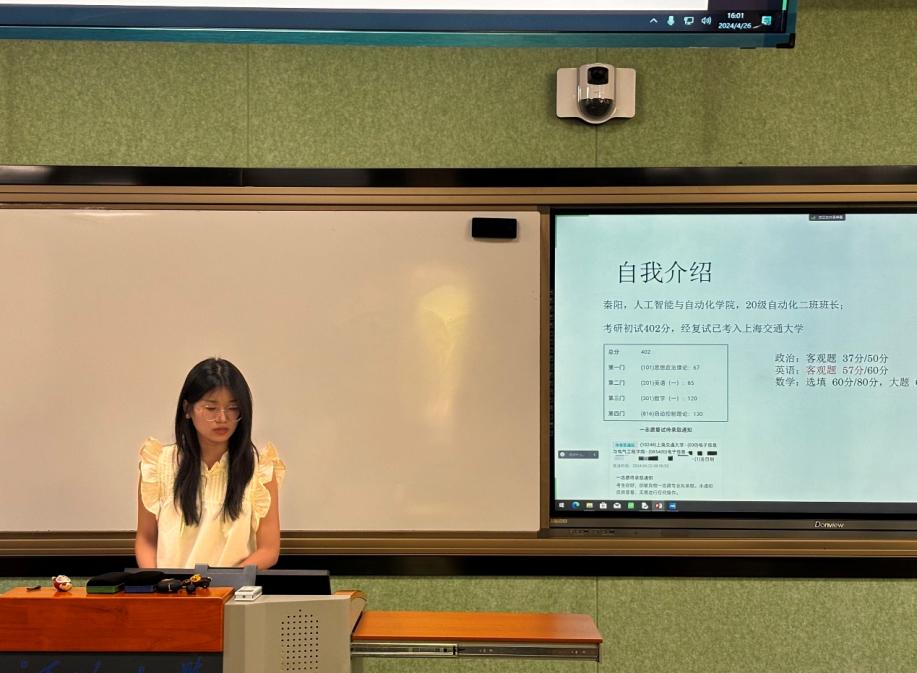 自动化专业的秦阳学姐成功考研至上海交通大学。她强调在学习上要有所取舍,抓紧碎片化时间。同时,她结合考研各个学科特点为同学们提供了极具个性的考研思路,使同学们受益匪浅。