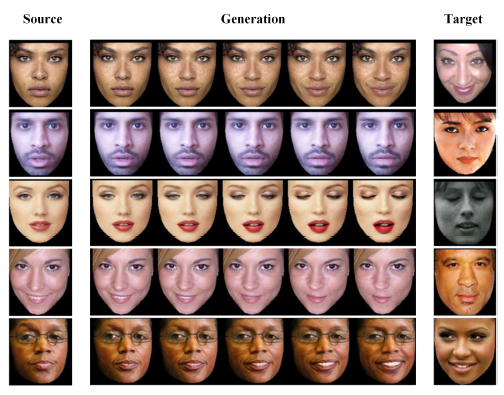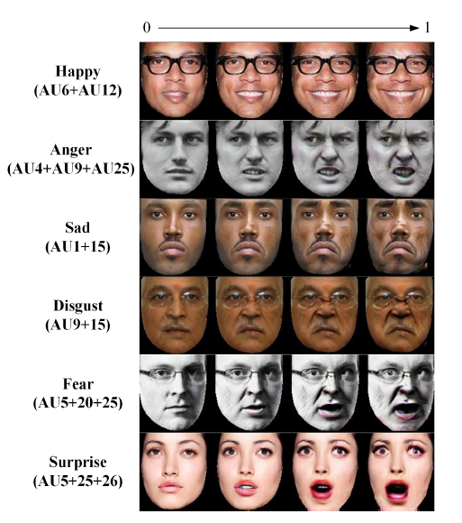 其次,团队研究人员选择了源表情和目标表情,并通过调整AUs的强度来生成中间的连续表情(图3),实验评估了连续面部表情生成的效果。结果显示,系统能够平滑地过渡表情,生成自然且连续的表情变化。这验证了所提出方法在生成连续表情方面的有效性,使机器人能够具有在不同情感状态之间过渡的能力。