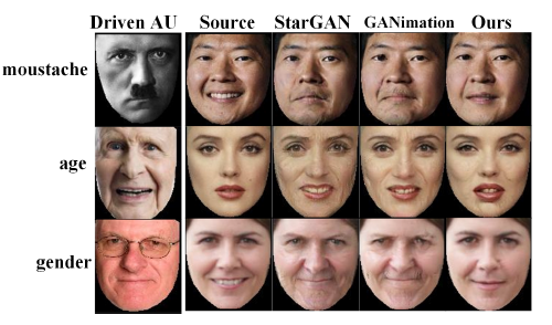 此外,为了评估不同方法在应对身份信息干扰时的表现情况,团队测试了AU-FEDS、StarGAN和GANimation三种方法,让它们处理带有胡须、皱纹等身份干扰信息的样本。结果表明AU-FEDS方法生成的图像比其他两种方法出现的伪影更少,并能更好地保持原始身份信息。这证明了AU-FEDS在处理带有身份信息干扰方面的优越性能。